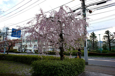 對了,今年櫻花開得特別早,大部份的櫻樹差不多半棵都冒出綠葉了,不過也是有幾株晚謝的。