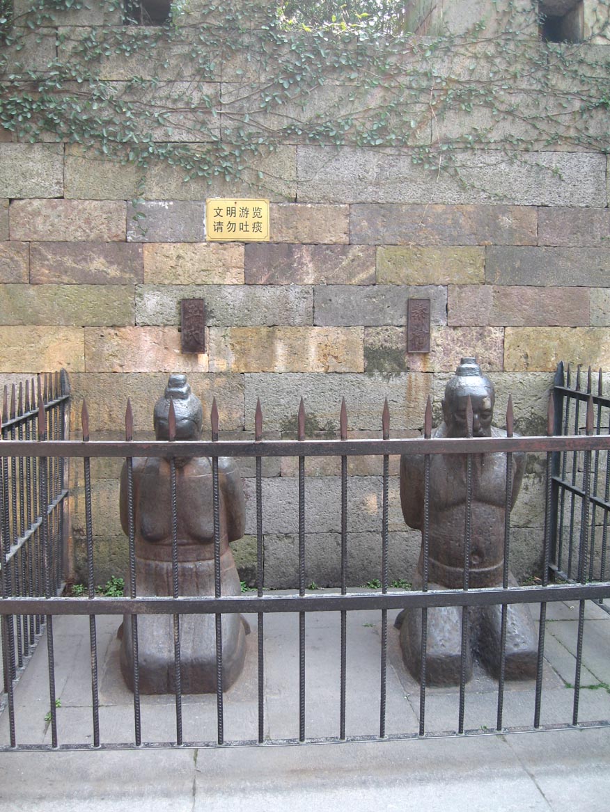 岳王廟,顧名思義是紀念岳飛的,很多次在課本上看到相關的照片,沒想到門票有夠貴的還要25元人民幣啊啊啊啊!話說我只想看讓大家都吐口水的秦檜像b岳王廟不算大,正殿是很大的岳飛像,兩邊則是供奉他的愛將(名字忘了囧),後方有一些紀念碑或小尊的雕像刻石,還有小小的竹林。往另一邊走就是岳飛的墳塚了,正前方放著四尊跪著的銅像(皆為裸身),就是四名陷害岳飛的逆賊,左邊是秦檜和他太太,右邊兩名(一個三角褲一個四角褲(←喂)),名字又忘了XD銅像是被鐵柵欄圍著的,大概是太常被吐口水吐痰,像的上方就貼著「文明遊覽,請勿吐痰」的標語。(如圖XD)
