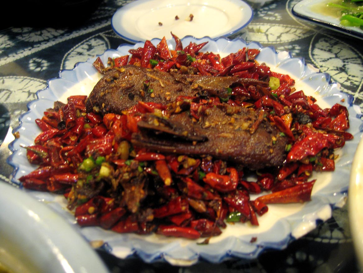 ↑這是剖成一半的鴨頭。有點恐怖不過很好吃,上面也全是辣椒囧